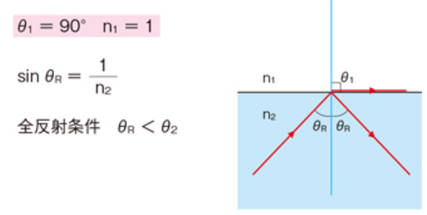 全反射条件:1光密介质到光疏介质;2入射角大于临界角 θ2>θR