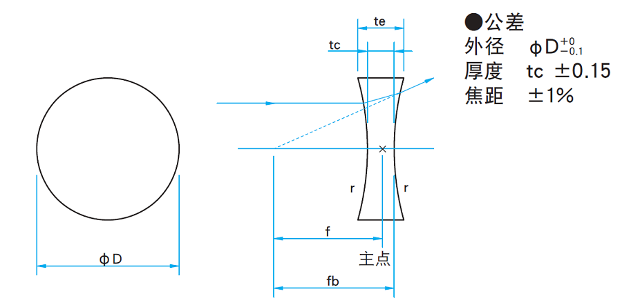 -凹面的外侧棱线加工有倒角,因此,有时边缘厚度(te)会比设计值小- 在可见光以外的波长条件下使用,色差可能会变大,而且,透过率可能降低。