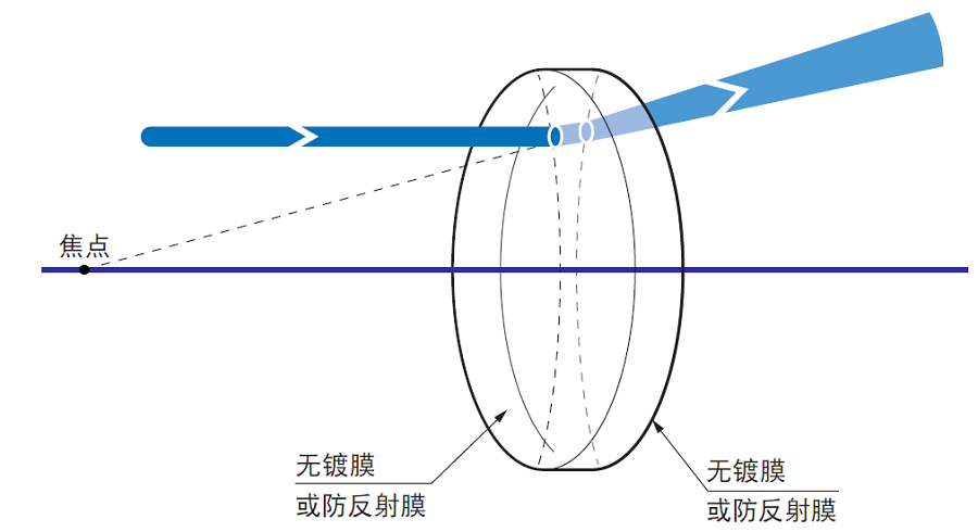 -使用高能量的脉冲激光时,由于凹面的反射光,在光路上聚积形成焦点光斑后,可能会出现闪光。用于脉冲激光时,请使用平凹透镜。