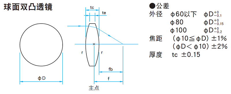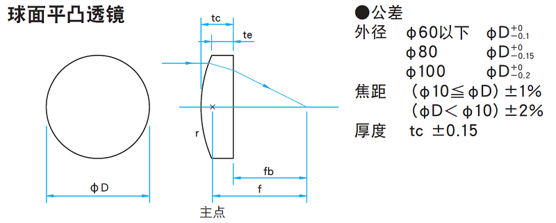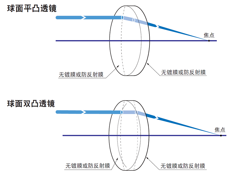 -球面平凸透镜,球面双凸透镜都有色差,其焦距随波长变化。各波长的焦距请参考网页上的“焦距随波长变化特性数据”