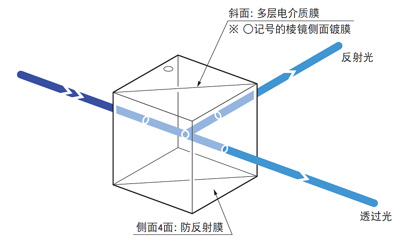 -电介质膜立方体从有○记号的棱镜侧面射入光。从棱镜相反侧面入射时,反射率或分束比,偏光特性可能会改变。