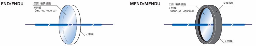 由于FND可见光反射型中性滤光片和FNDU紫外光反射型ND滤光片的规格一致,所以只列出FND和MFND反射型中性滤光片的型号。