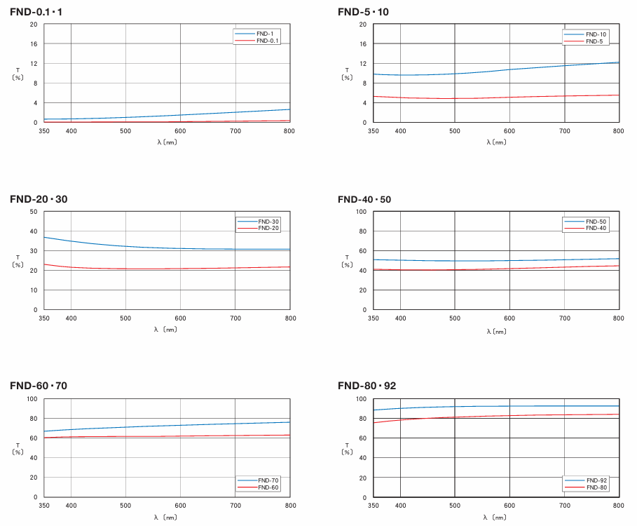 Optosigma的反射型中性密度(ND)滤光片利用金属膜进行反射,因此其在紫外到红外整个波长范围内都表现出非常稳定的透过率特性。特别地,用于紫外光领域的反射型ND滤光片,其基板材料选用具有高紫外透过率的合成石英,这使得该滤光片在近紫外到可见光光谱区域均能保持近乎一致的透过率。可见光ND滤光片的玻璃厚度为2mm±0.1mm,与透过率无关是一定值。西格玛光机FND衰减片分为可见光用的FND滤光片和紫外光用的FNDU滤光片。FND可见光反射型中性滤光片采用BK7材质的玻璃,镀铬膜(FND-92、FNDU-92、MFND-92、MFNDU-92无镀膜),适用于400~700nm,面型精度λ(测量范围φ30mm),平行度<1′,表面质量:60-40,有效直径:外径的90%。