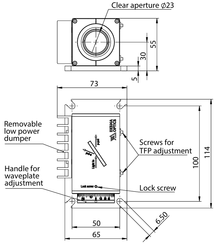 Eksma可变激光功率衰减器990-0077、990-0078基于固定在 56° 的布儒斯特型薄膜偏振器和石英半波片。功率可调激光分束器入射角可以手动调整,以获得最佳对比度或操纵反射的 s 偏振光束的方向。波片安装在 360° 连续旋转支架中,可以手动旋转以控制透射和反射光束的输出功率。
