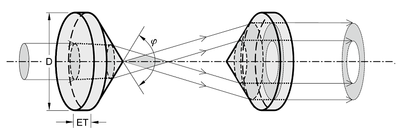 Eksma的轴锥镜具有一个圆锥面和一个平面,其特性可以通过顶角来定义。这种轴锥镜能够将光转换成环形,或者在近场中将近似为准直的高斯光束转变为非衍射贝塞尔光束。此外,轴锥镜与球面透镜的组合使用,可以将平行的激光束转化为具有厚壁的空心光“管”,或者产生环形焦点。(见图2)
