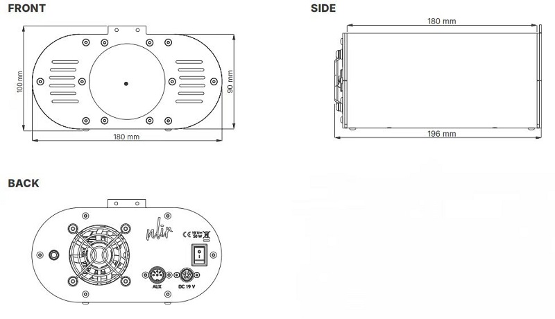 图纸提供了丹麦NLIR AURALIS光源的详细尺寸和设计概览。AURALIS光源后部面板装有绿色LED指示灯,用于显示设备正常运行状态。该光源配有19V直流电源输入接口和AUX端口,可直接从NLIR光谱仪获取电源,便于系统集成。前部面板的光学输出口采用3英寸CaF2窗口,可保护用户免受设备内部高温灯丝的伤害。注:所有尺寸单位均为mm。