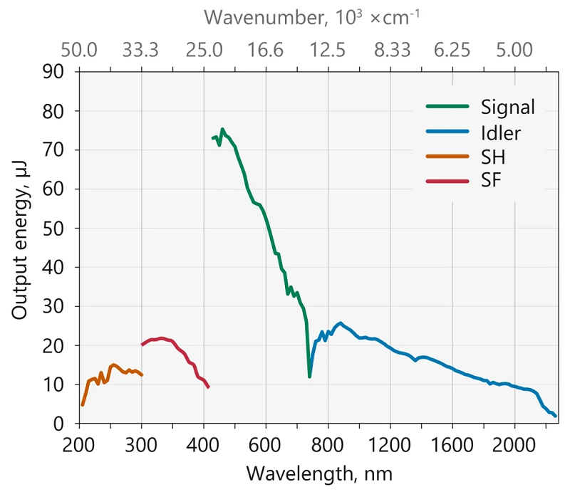 PT403皮秒可调激光器在信号光(410–709nm)、闲频光(710–2300nm)范围和SH(210–300nm)、SF(300–409nm)范围内的调谐曲线