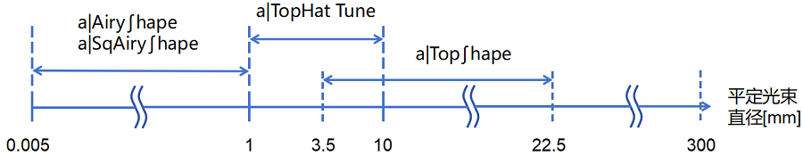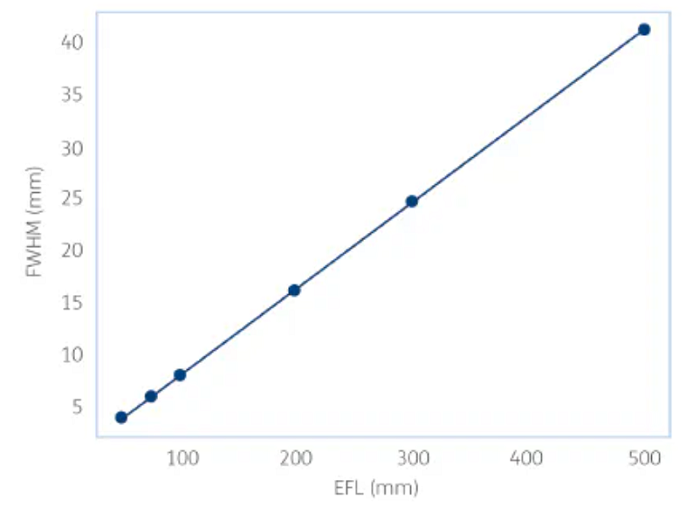 毫米级可调圆形光束整形器平顶光斑大小与EFL的关系图,输出平顶光斑随着焦距增加而变大