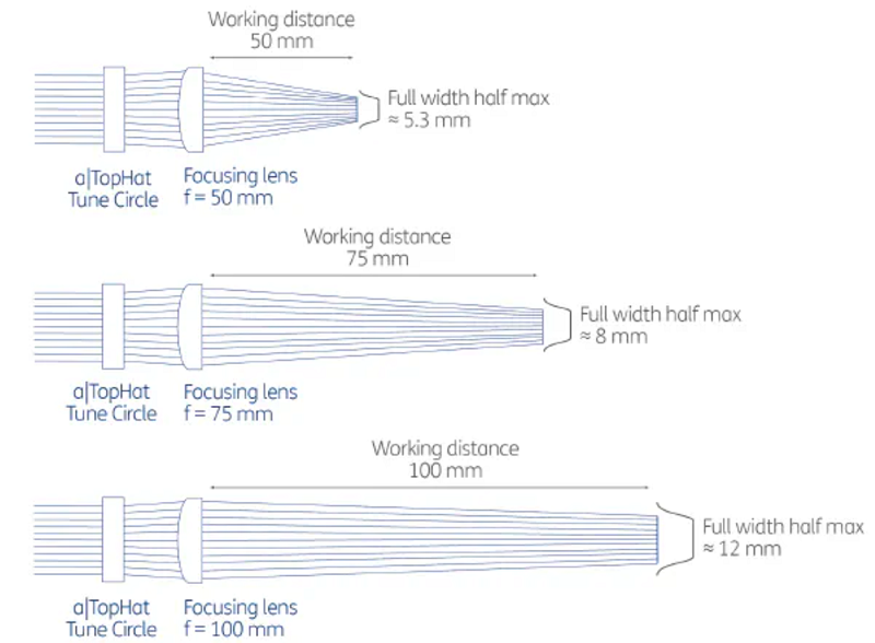 a|TopHat Tune Circle旨在生成精确的圆形平顶光斑,其光束直径范围为1至10毫米,使这款Asphericon可调圆形光束整形镜成为材料加工和其他要求苛刻的光学应用的必选产品。毫米级可调圆形光束整形器与各种焦距的聚焦透镜一起配合工作,在调整工作距离和轮廓直径方面提供了非凡的灵活性。通过调整聚焦透镜的焦距,用户可以灵活地调整工作距离和可调非球面镜光束整形器光束直径,同时保持均匀的光束轮廓,展示了平顶光束整形器的多功能性。