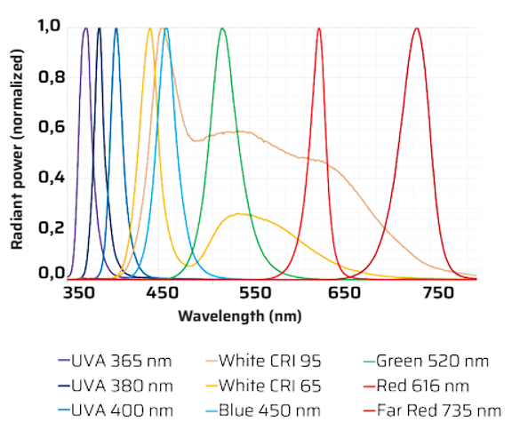 LED脉冲光源:采用COB封装的多芯片阵列。多光谱闪光系统的365nm紫外版本功率达13.2W(自由光束)。LED脉冲光源支持TTL触发(0-5V),兼容主流工业相机。