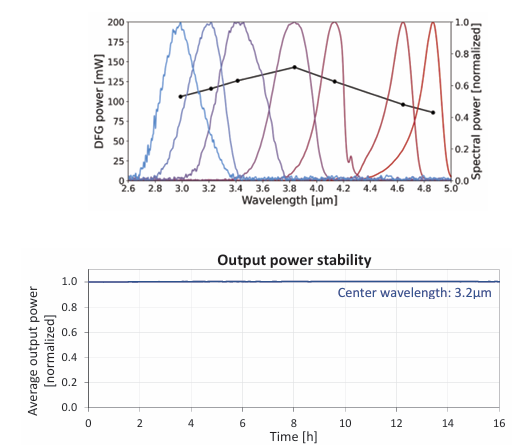 YLMO中红外飞秒光纤激光器的光谱范围为3-5μm,拥有较大的光谱带宽,可以达到300cm-1。这款中红外光纤激光器在选定的光谱内平均功率>100mW,>100 mW3.0-4.2μm, 高于4.2μm最佳值。