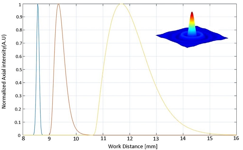 不同调焦位置(从最小视场角度(蓝色)到最大视场角度(黄色))的可变焦深贝塞尔切割头标准化聚焦强度。