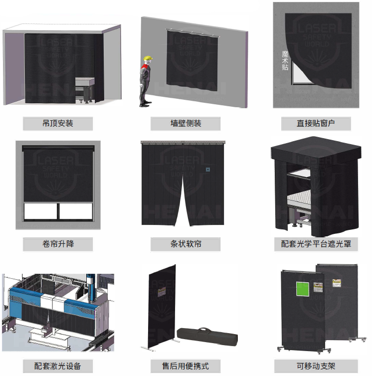 吊顶安装、墙壁侧装、直接贴窗户、卷帘升降、可移动支架、固定支架、 折叠式、条状软帘、售后便携式、配套激光设备、配套光学仪器架 |