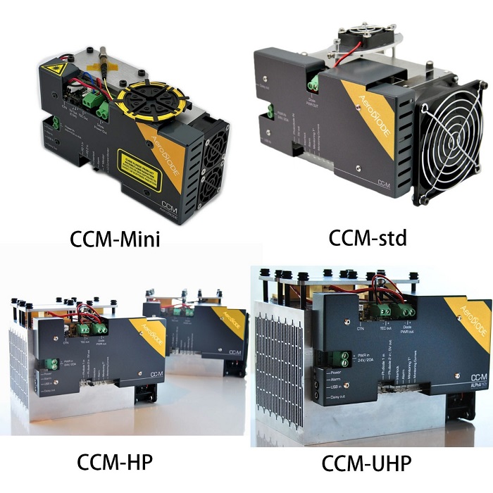 CCM(Cool and Control Multimode)是一种24V供电设备。提供四个子型号,其中AeroDIODE大功率激光二极管驱动器的最大光功率分别为20W,60W,120W,180W。激光功率稳定性<0.05%,最大调制率达到100kHz。低功率版配置包括1* TEC冷却器30*30,标准版配置包括2*TEC冷却器30*30,高功率版配置包括2*TEC冷却器40*40,超高功率版配置包括2*TEC冷却器50*50。