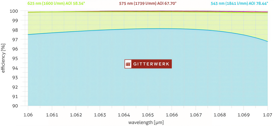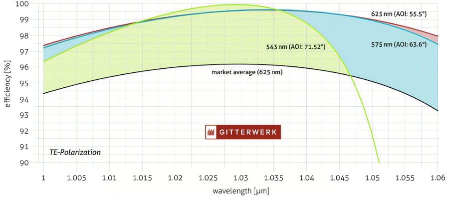 凭借Gitterwerk光栅的高效率(高达99.5%),与市场平均水平相比,可以将激光功率提高多达20%。德国Gitterwerk内部在光栅设计方面的专业知识以及对波长范围进行精细调整的能力,使能够将1030nm光栅应用于几乎所有工业或科学领域。