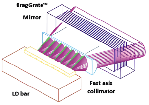使用高功率反射式体布拉格光栅(Reflecting Bragg Grating)对LD条形锁定示意图
