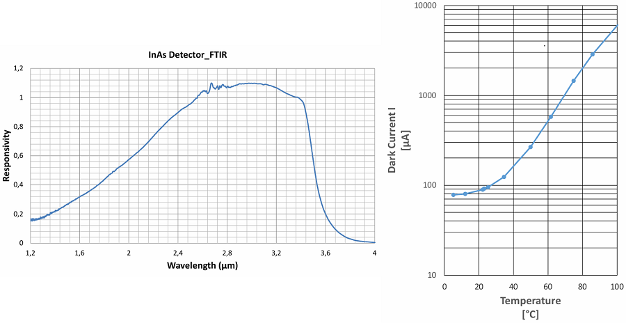 900~3500nm InAs探测器,LASER COMPONENTS响应与暗电流的温度依赖性曲线: