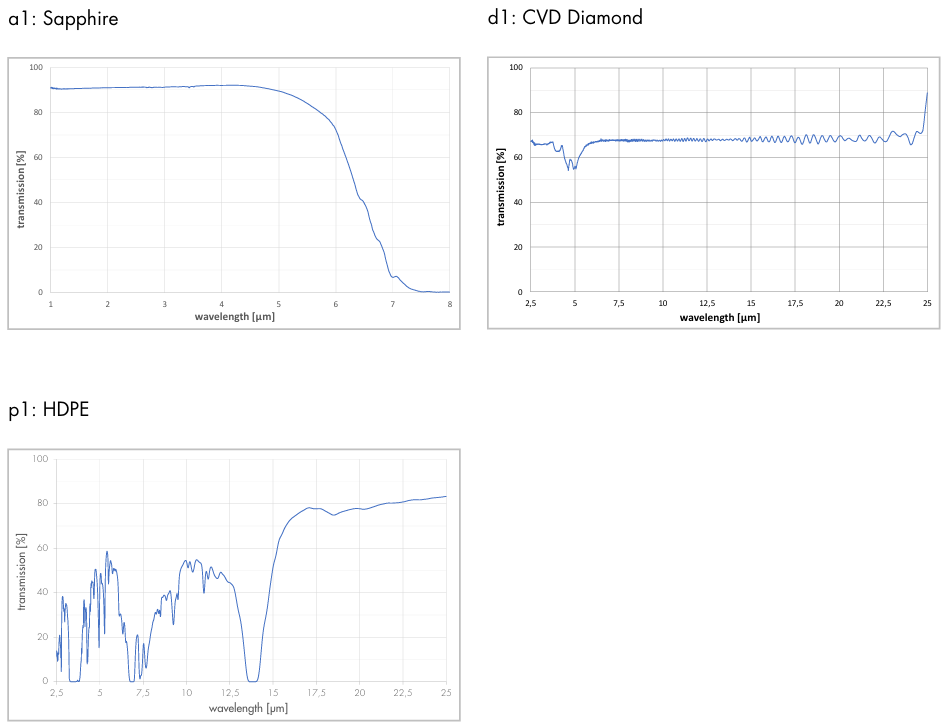 对于太赫兹波段,HDPE窗口片透射范围显著超过60μm。先进钽酸锂红外探测器在出厂时以1kHz频率校准,适用频率范围可达约10kHz。该先进红外钽酸锂探测器对红外通量变化具有快速响应特性,满足FTIR系统对红外探测器的性能要求。工作温度范围为-20至+55℃,与所有光学元件相同,该高功率红外光谱探测器需在无冷凝环境中工作。KBr和CsI等红外透射窗口片具有吸湿性,应避免暴露于高湿度环境。