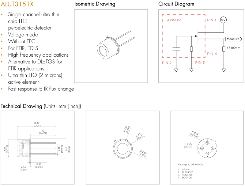 先进热释电探测器ALUT3151X:负载电阻10GΩ,放大电路JFET2,电源电压推荐9V最大25V,极性为负极性。