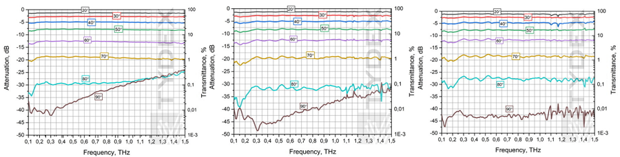 从图2我们可以看出,当太赫兹可调精密衰减器检偏器旋转角度超过70°时,透过率仅剩1%,衰减率-20dB。当THz可调衰减器检偏器旋转角度为20°,30°,40°,50°,60°,70°,时,三款可调谐太赫兹衰减器的衰减率在整个波段几乎一致。当THz可调衰减器检偏器旋转角度为80°时,在0.1-0.3THz波段,Tydex可调衰减器的衰减率变化较大。