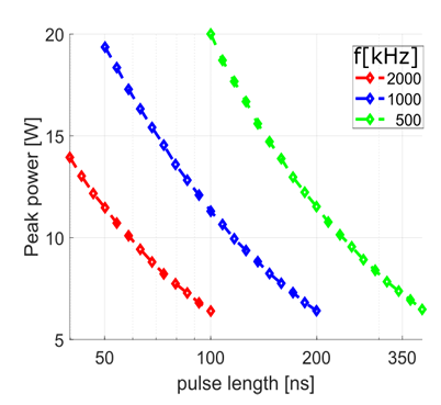 可调脉宽光纤激光器PHOENIX+2039在固定波长2039nm下,峰值功率与脉冲宽度。