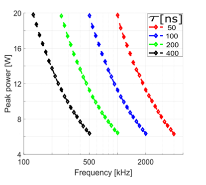 2μm连续/脉冲输出光纤激光器PHOENIX-2040在固定波长2040nm下,不同重复频率对应的峰值功率随脉冲宽度的变化曲线。在任一固定频率下,峰值功率随脉冲宽度的增加而显著降低。