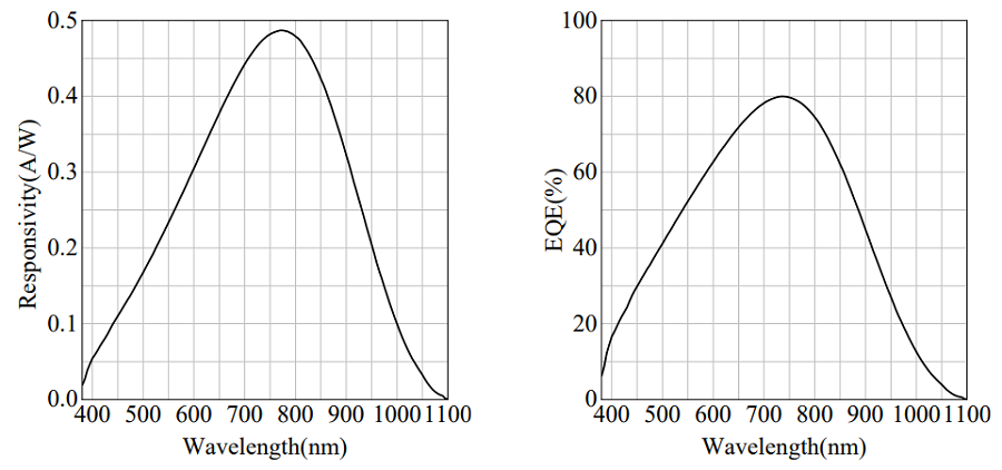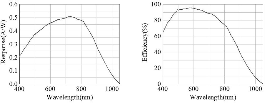 左边是光谱响应图,右边是量子效率与波长的关系图
