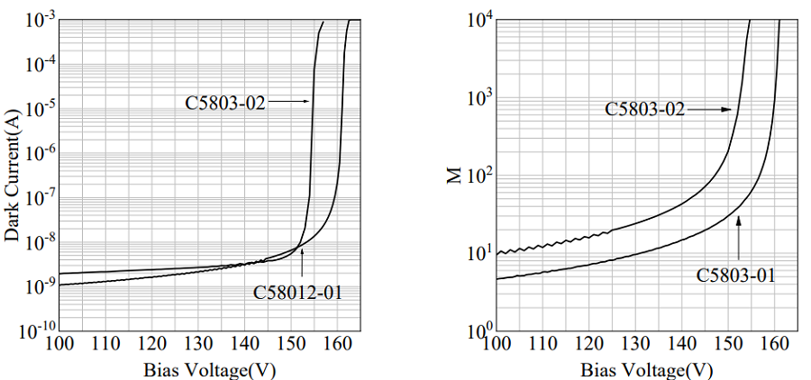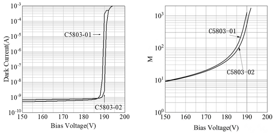 左边是增强型雪崩光电二极管暗电流与反向电压关系图,右边是增益和反向电压关系图