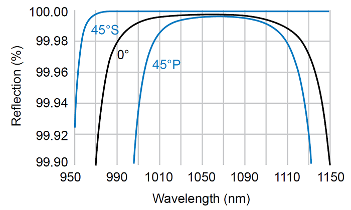 IBS反射镜受偏振光影响小,在1064nm,532nm,355nm和266nm的45°入射光线中,S偏振光和P偏振光在中心波段上均能稳定达到99.9%反射率。