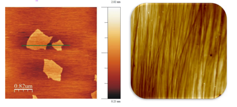 左:使用ezAFM扫描单层石墨烯的成像 右:使用ezAFM对蓝宝石表面扫描成像